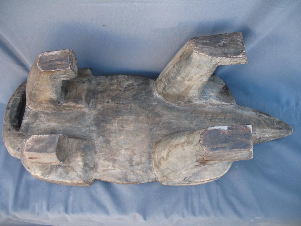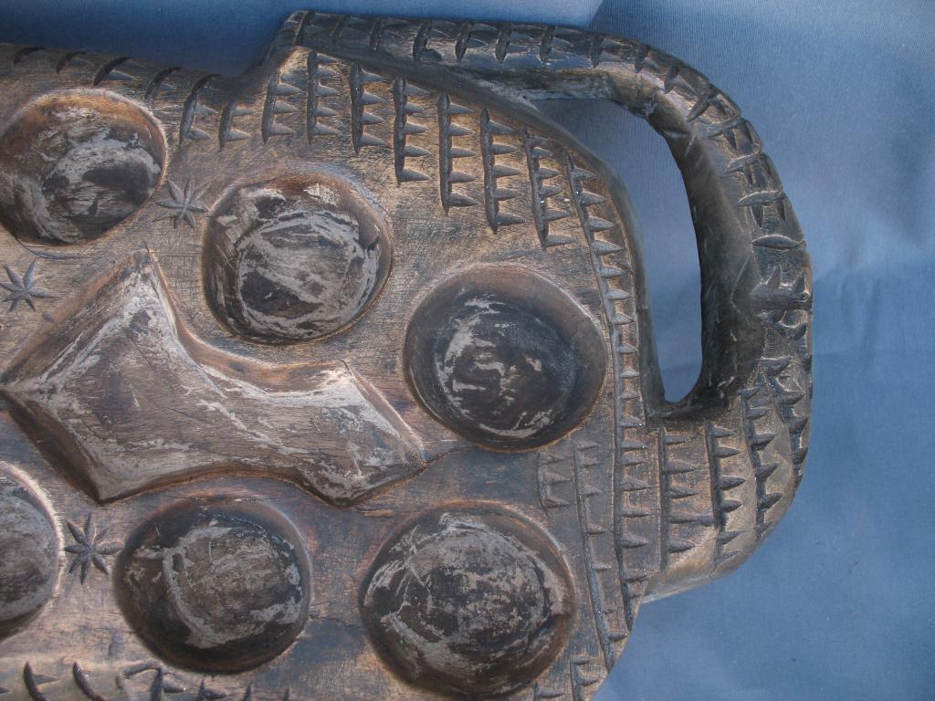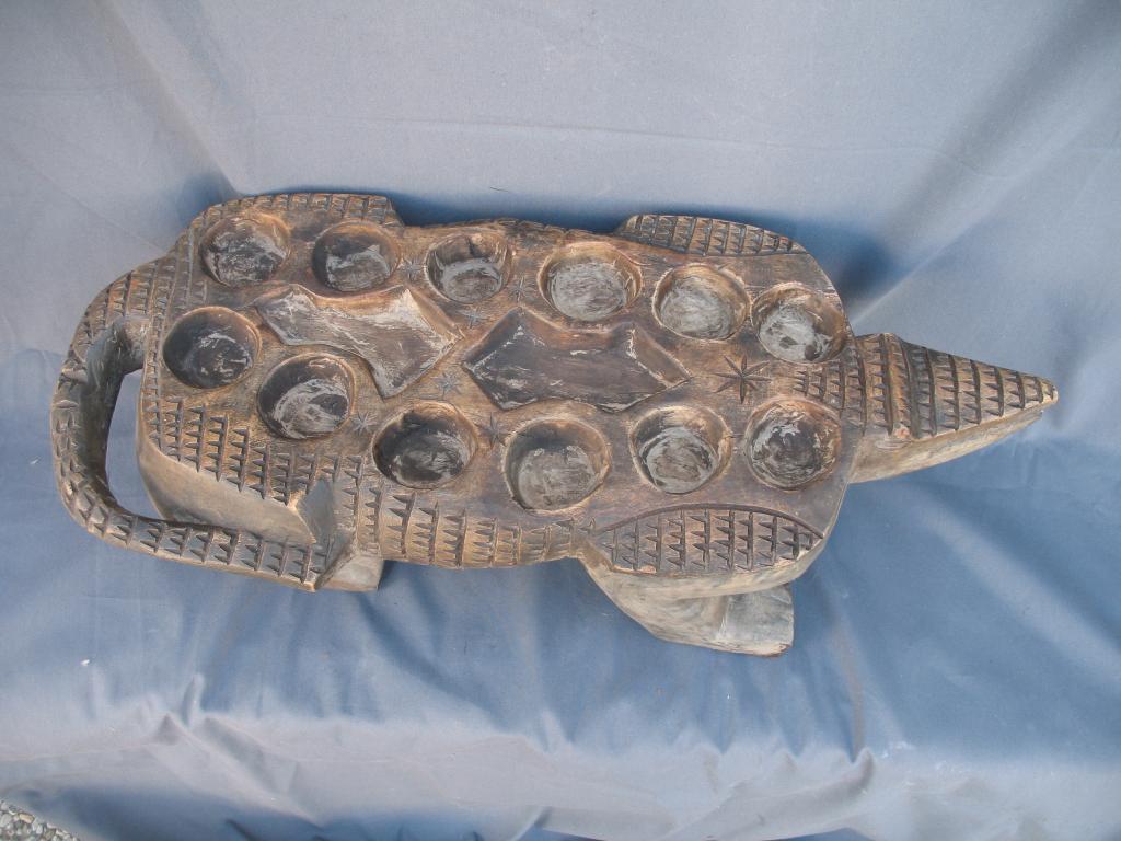 Gran juego del awalé que representa un cocodrilo. El cocodrilo es el dispensador del agua a la tierra. Es el animal rey de los ríos y de las lagunas costeras con gran raigambre en Costa de Marfil. Es conocido el famoso lago de los cocodrilos del difunto presidente Félix Houphouet Boigny. Y este animal es reproducido en numerosos pesos akan de pesar el oro, frecuentemente con un pez en su boca y sus mandíbulas son imitadas en muchas máscaras zoomorfas. Es para los Baulé un espíritu del agua y un símbolo de la vida y de la fecundidad. Pátina de uso.