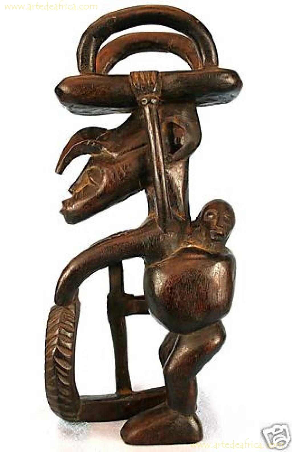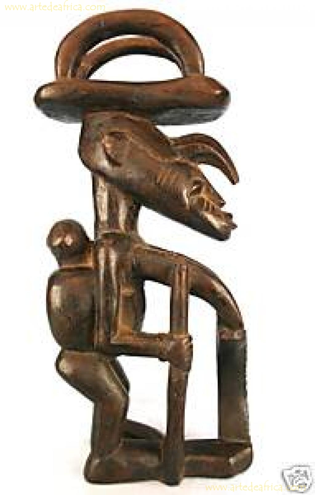 Rara maternidad que represengta a una madre que va al campo con su hijo a la espalda, en la posición tradicional africana, transportando lo que parece un taburete invertido sobre la cabeza.